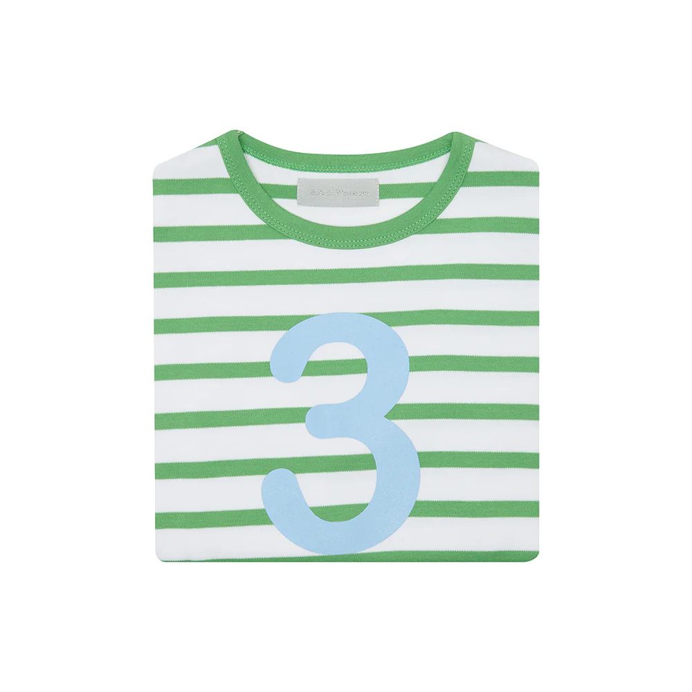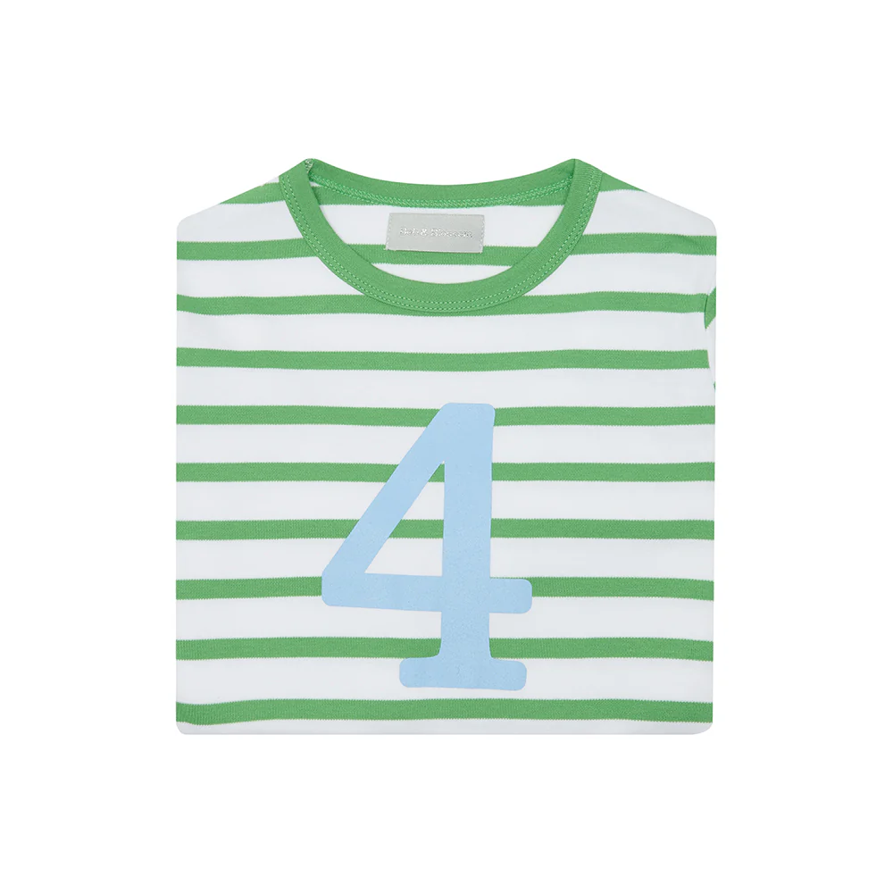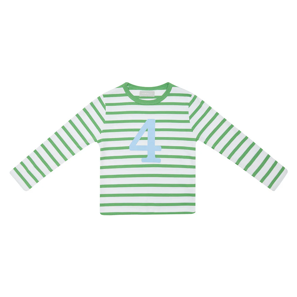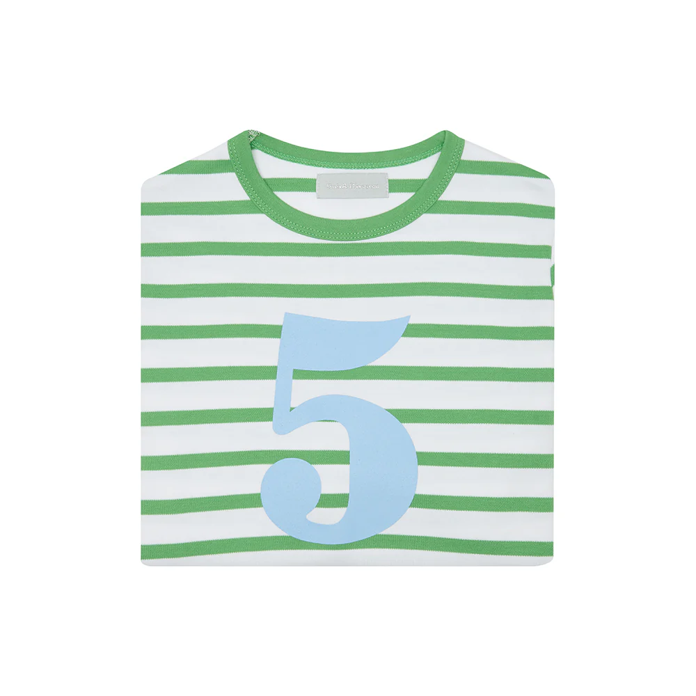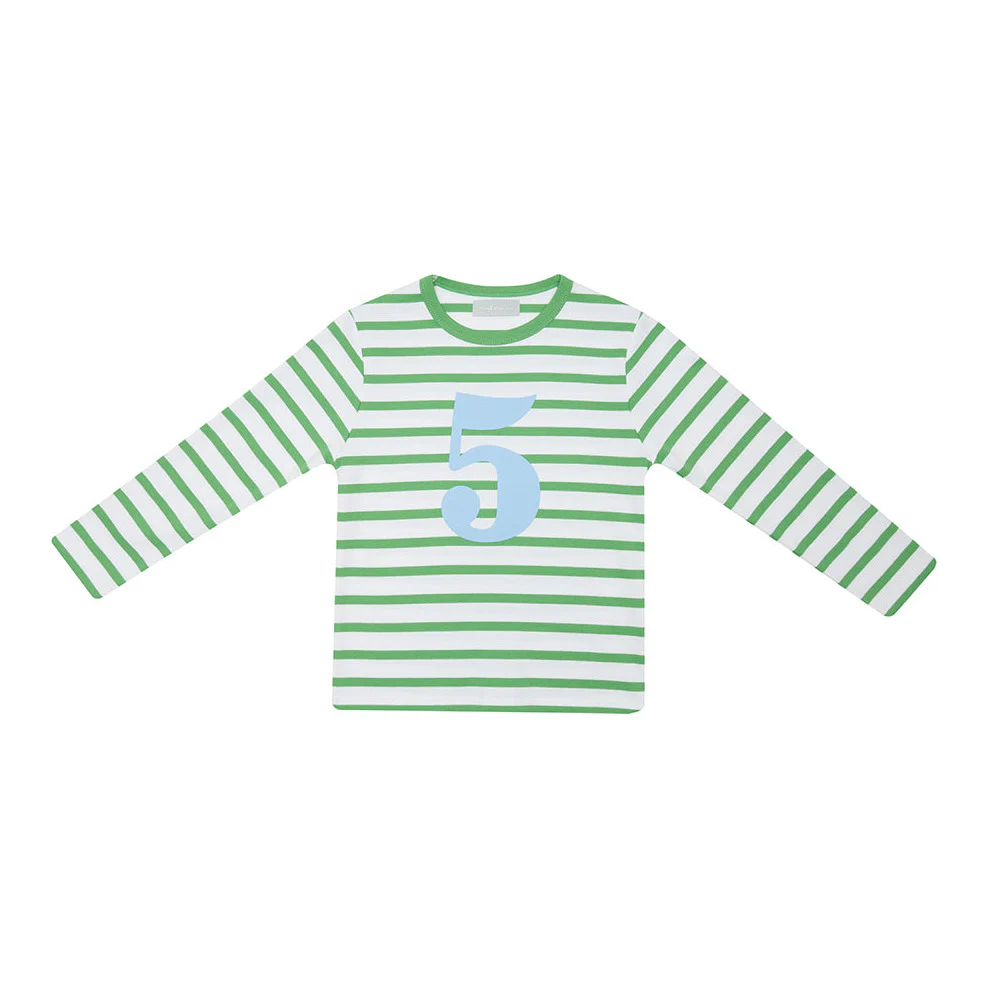 Grass green & white Breton striped cotton T shirt, featuring a sky blue number 1-5 screen print. Long Sleeves only.