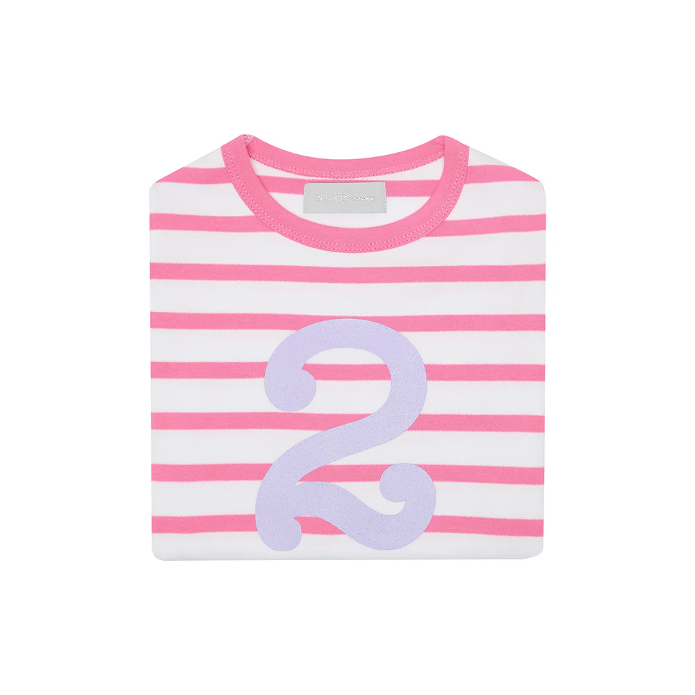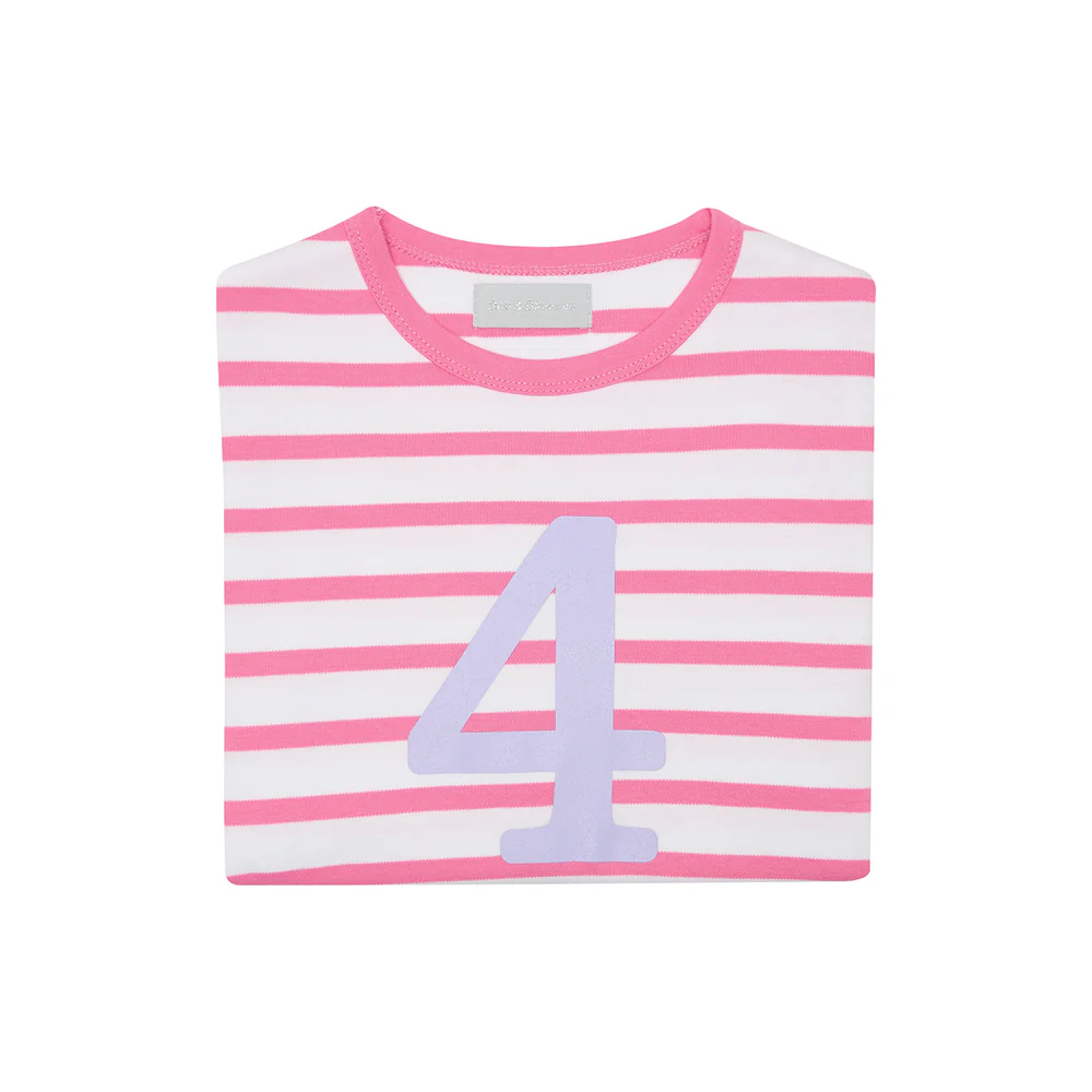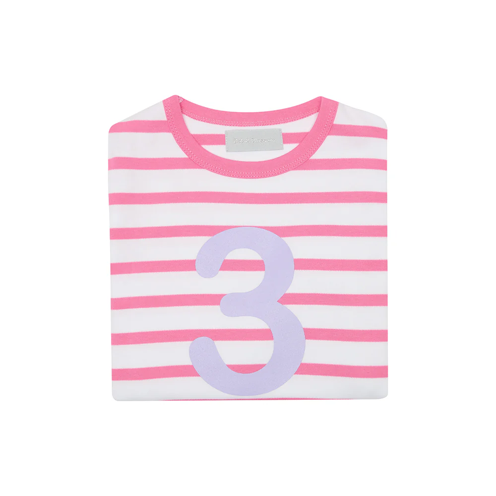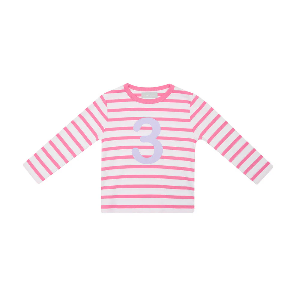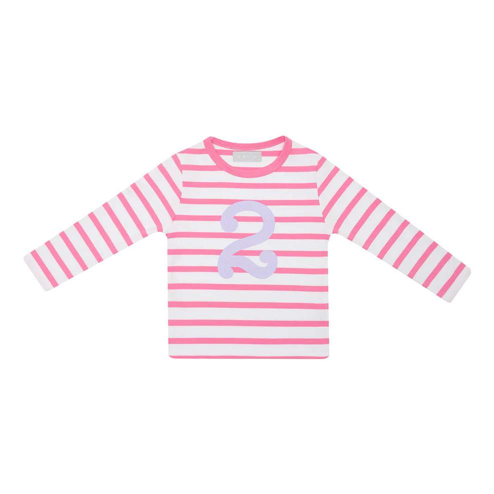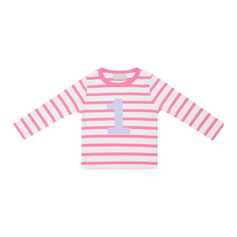 Hot pink & white Breton striped cotton T shirt, featuring a lilac number 1-5 screen print. Long Sleeves only.