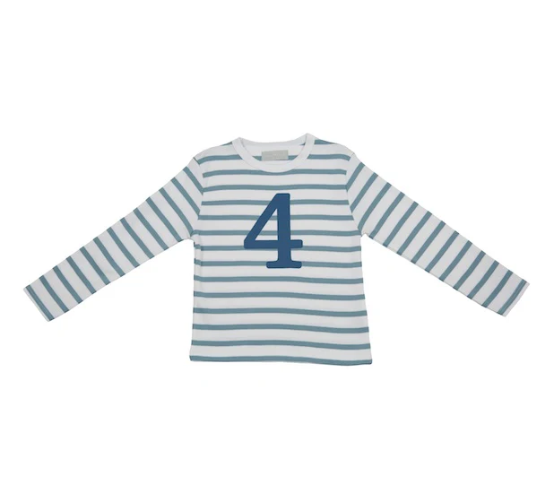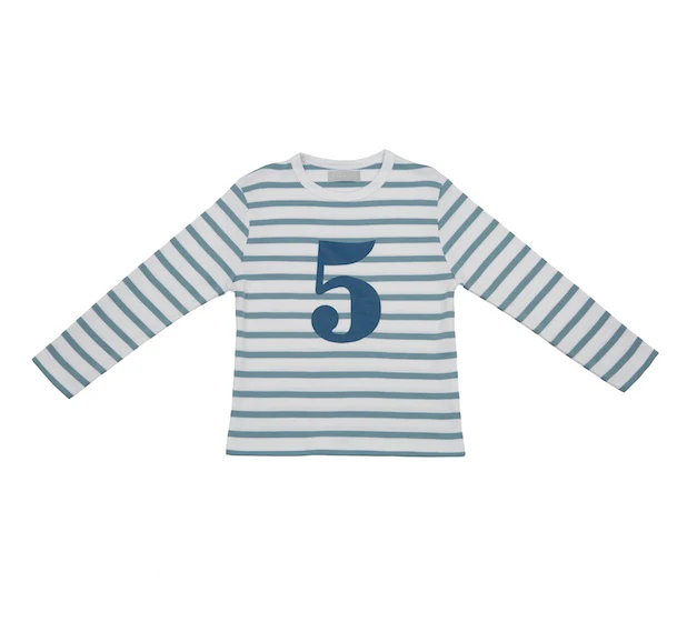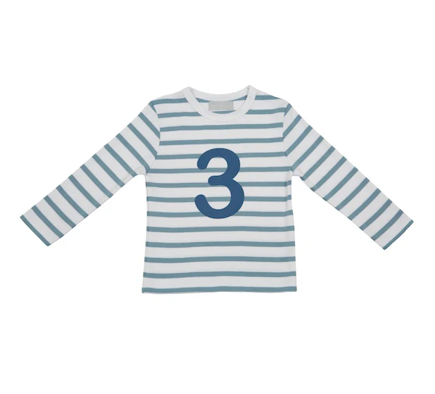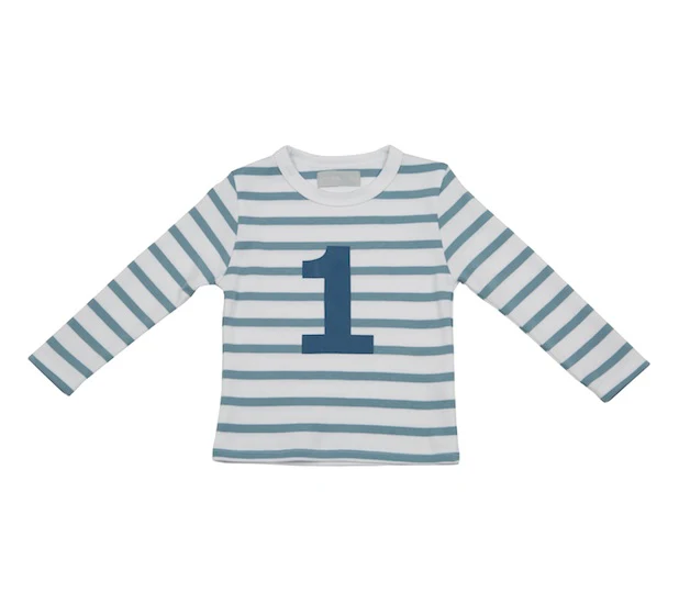 Ocean blue & white breton striped cotton T shirt, featuring a denim blue number 1 screen print. Long Sleeves only.