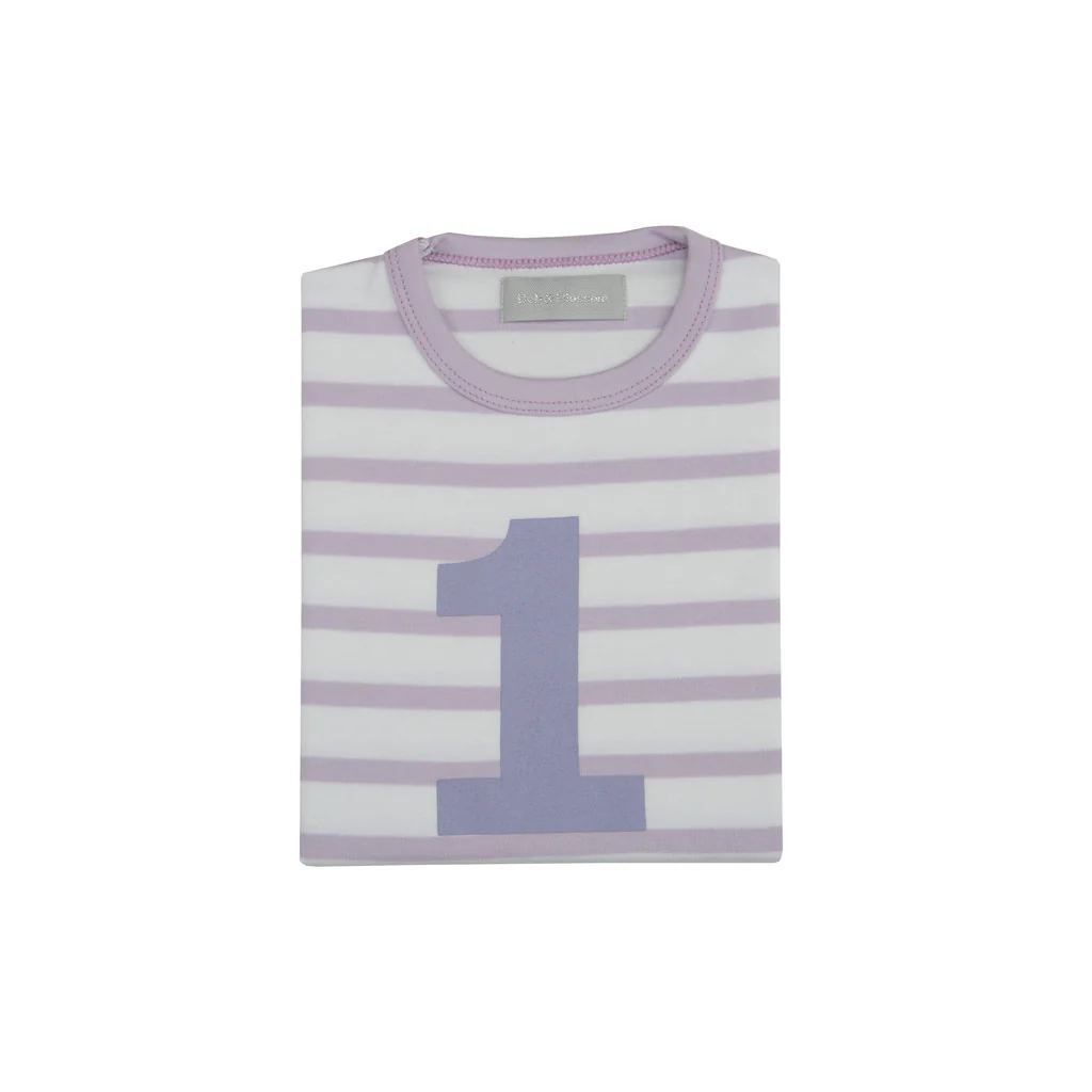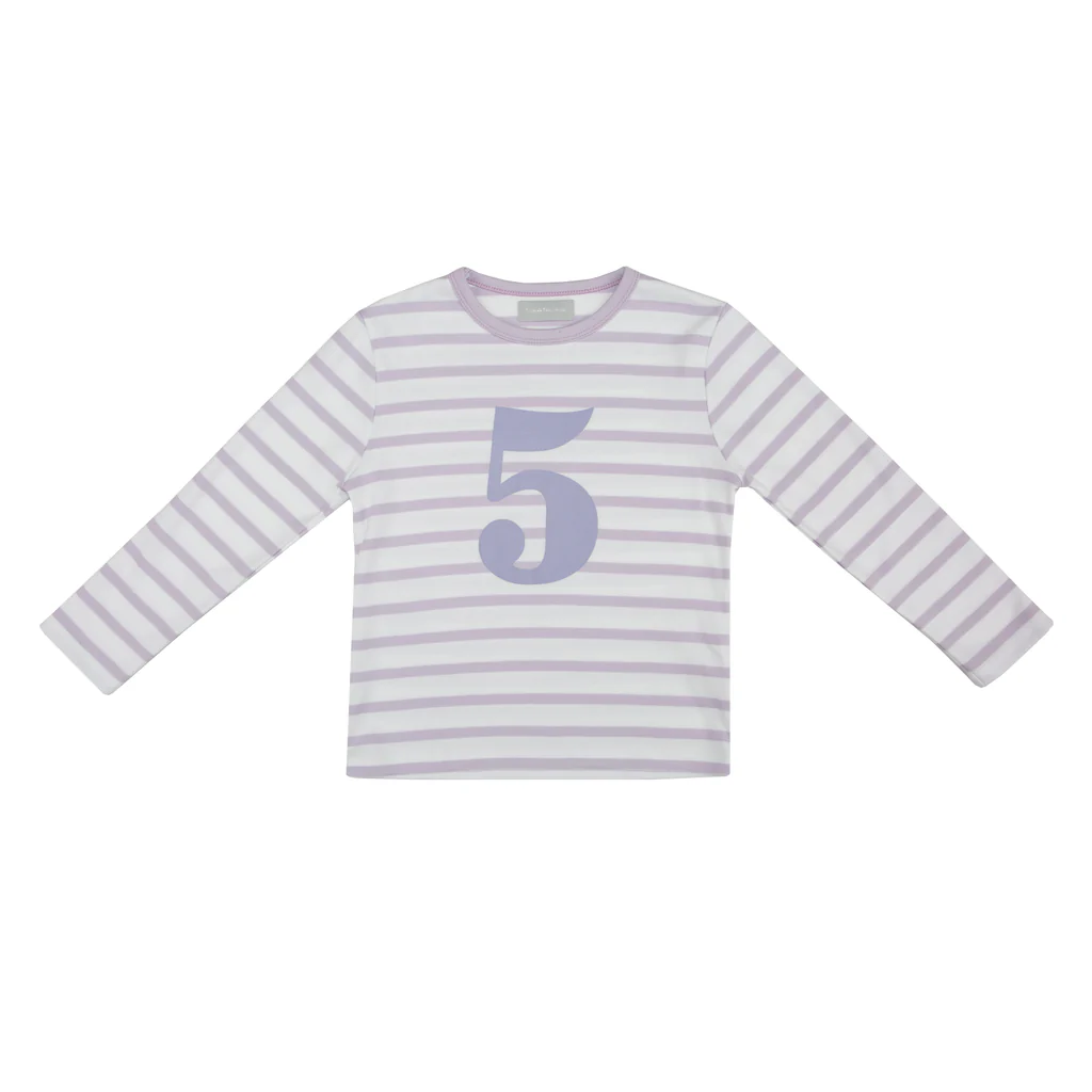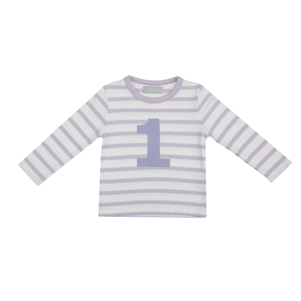 Parma violet & white breton striped cotton T shirt, featuring a parma violet number 1-5 screen print. Long Sleeves only.