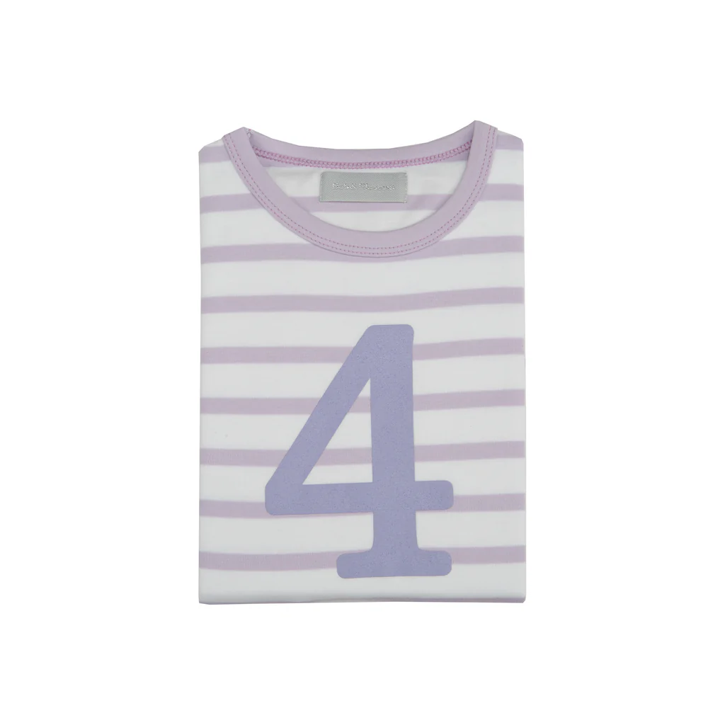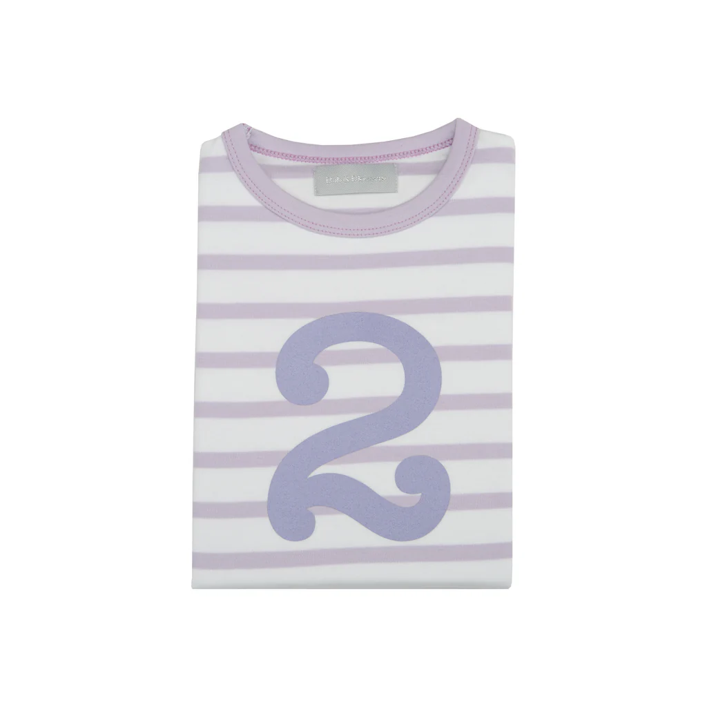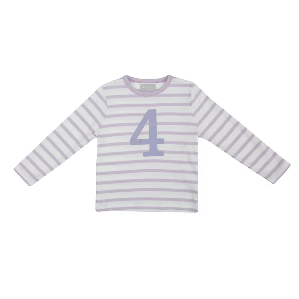 Parma violet & white breton striped cotton T shirt, featuring a parma violet number 1-5 screen print. Long Sleeves only.